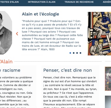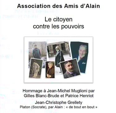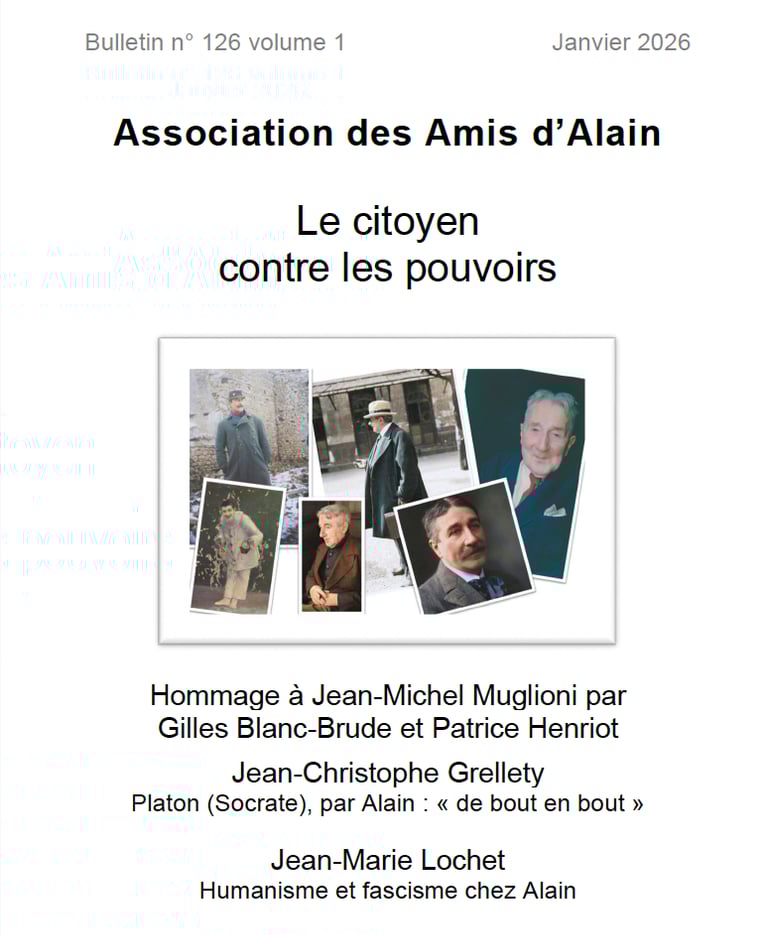Elle incite à la lecture, relecture, des oeuvres et des textes de ce professeur de Philosophie, devenu, par son travail, "philosophe". Formé par des écoles de la IIIème République, le jeune élève a beaucoup travaillé, comme l'école le lui demandait, avant de commencer un travail personnel, là où d'autres se sont contentés de produire des cours. Les évènements, les structures de son époque, furent tels qu'il ne lui a pas paru possible de se taire. Alain a donc beaucoup écrit, parlé, publiquement. Son engagement contre le militarisme, pour la paix, n'était pas plus facile qu'il ne l'est maintenant - mais au moins, à son époque, des armes d'extermination des peuples et du vivant n'existaient pas, et si elles avaient déjà existé, son engagement n'en aurait été que plus fort et radical. Hélas, à notre époque, tant se soumettent à la force des armes, qu'il ne faut pas confondre avec une "loi" humaine, digne de ce nom. Elles permettent à n'importe quel capricieux, sanguin, de décider de la mort de tant d'êtres humains, au motif de son bon plaisir et d'une prétendue "nécessité". Pour construire sa pensée, Alain a beaucoup lu, et notamment Platon. C'est ce qui a conduit à la rédaction et à la publication de ce texte, dans le bulletin de l'association.