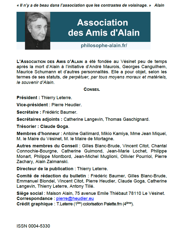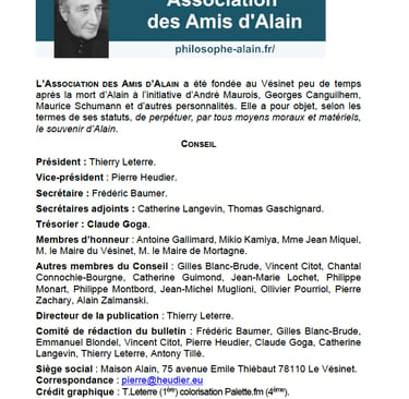 L'association des amis d'Alain a été fondée 20 jours après le décès d'Émile-Auguste Chartier, surnommé "Alain", né le 3 mars 1868 à Mortagne-au-Perche, mort le 2 juin 1951 au Vésinet. Près de 75 ans plus tard, l'association existe encore, par l'engagement de lecteurs et lectrices, admirateurs d'un intellectuel français dont les oeuvres, les "propos", ont survécu à leur époque - ce qui ne sera pas le cas d'intellectuels actuels, médiatisés. L'association est animée par un conseil dont des membres sont indiqués par leur nom (image ci-dessus).