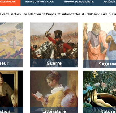 Des extraits de ses textes sont disponibles via des catégories, comme présentées ci-dessus.