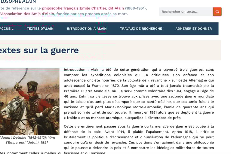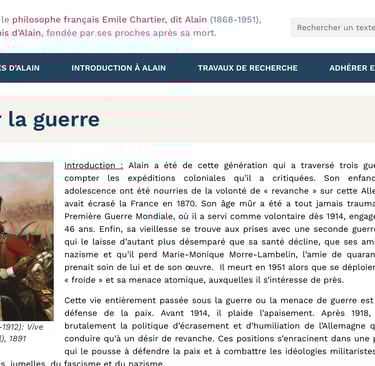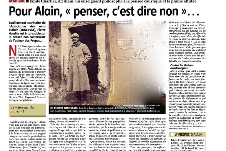 Par exemple, sur et contre "la guerre". La guerre (ce mot allemand en langue française), Alain l'a connu de près, puisqu'il s'est engagé en 1914, alors que commençait ce que l'on appelle la "première guerre mondiale". "Philosophe", il le démontre, dès lors qu'il prend le contrepied du "on dit" social dominant. Par exemple, il faut lire "La paix par le droit" : "Celui qui a proposé cette formule connue : « la paix par le droit » a fait tenir, il me semble, beaucoup d’erreurs en peu de mots. Là-dessus j’ai d’abord réfléchi longtemps, sans beaucoup de suite et sans jamais rien découvrir ; et puis, quand la guerre m’a tenu sur ce problème pendant des heures et des jours, j’ai enfin compris que les bonnes intentions ne mènent à rien tant que les idées sont mal attelées. « La paix par le droit », c’est un cri de guerre, à bien l’entendre ; c’est même le cri de la guerre. La première erreur qu’il faut effacer, c’est (...)". Dans le contexte actuel, sa critique de l'aporie de l'invocation du "droit" démontre à quel point ce qui domine la parole publique nationale est de si faible portée, profondeur.