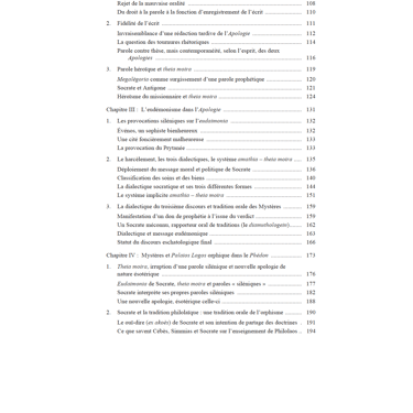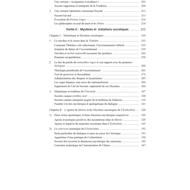 Depuis la mort de Socrate et de Platon, plus de deux millénaires se sont écoulés. Les Grecs anciens ont disparu, et avec eux, leur culture propre. Toute culture se définit par une série de "codes" : au premier chef, la langue, et, ensuite, les pratiques sociales, les signifiants symboliques. Des lecteurs des Dialogues de Platon ont pu prétendre qu'il suffisait de lire ces oeuvres, pour les comprendre et dialoguer avec elles, et, à un certain niveau, sur certains sujets, cette conviction, cette affirmation, étaient fondées, sensées. Mais la lecture attentive de ces oeuvres nous confronte à des problèmes importants, dans la mesure où ce qui était évident pour Platon et ses contemporains ne l'est plus pour nous. Ainsi, s'il est encore fréquent que des lectures de La République, de son premier livre, passent sur des détails du propos, notamment sur l'identité des interlocuteurs de Socrate, comme si ceux-ci avaient été choisis parmi d'autres, autres qui auraient tout aussi pu être choisis à leur place, comme si la discussion engagée entre Socrate et son hôte, Céphale, des membres de sa famille et de ses invités, était une discussion mondaine entre amis qui ne se voyaient pas souvent (ce que Céphale affirme), des chercheurs, eux, attentifs à ces détails, ont pu démontrer qu'ils étaient lourds de sens, poids qui avait pu être ignoré en raison même d'une insuffisante ou nulle culture contemporaine de ce que fut cette culture grecque, son Histoire. C'est pourquoi, pour se donner toutes les chances de bien comprendre le propos de Platon, de ne pas commettre une erreur de lecture/interprétation, des connaissances, disponibles, proposées par diverses sciences humaines, sont nécessaires. Avec son ouvrage Mystères socratiques et Traditions orales de l'eudémonisme dans les Dialogues de Platon, Jean-Luc Périllié, qui a été maître de conférences en philosophie ancienne à l'Université de Paul Valéry (Montpellier III) propose un travail en profondeur, avec un volume de 500 pages environ, une bibliographie de 11 pages. L'ouvrage comporte deux parties principales, "Phénoménalité et vérité du Socrate mystérique", avec 4 chapitres, et "Mystères et initiations socratiques", pour 3 chapitres.
